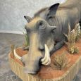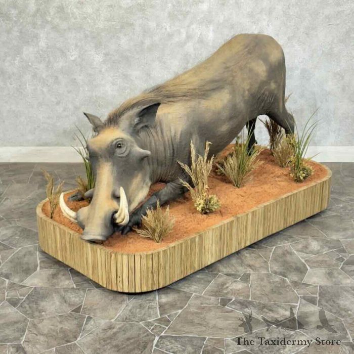 For sale, we have a magnificent Warthog taxidermy life-size mount, posed rooting the ground of a custom African habitat base. This Warthog features a phenomenal hide, outstanding hair, top-notch taxidermy craftsmanship, and a great set of teeth that measure 7 1/8″” and 7 6/8″”. The habitat base mimics the African plains where the Warthog roams, featuring laterite dirt and faux vegetation. All applicable measurements and dimensions are provided to help ensure this item will fit within your intended space, as well as meet expectations regarding the item’s featured attribute sizes, scores, etc.