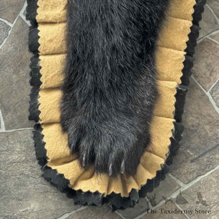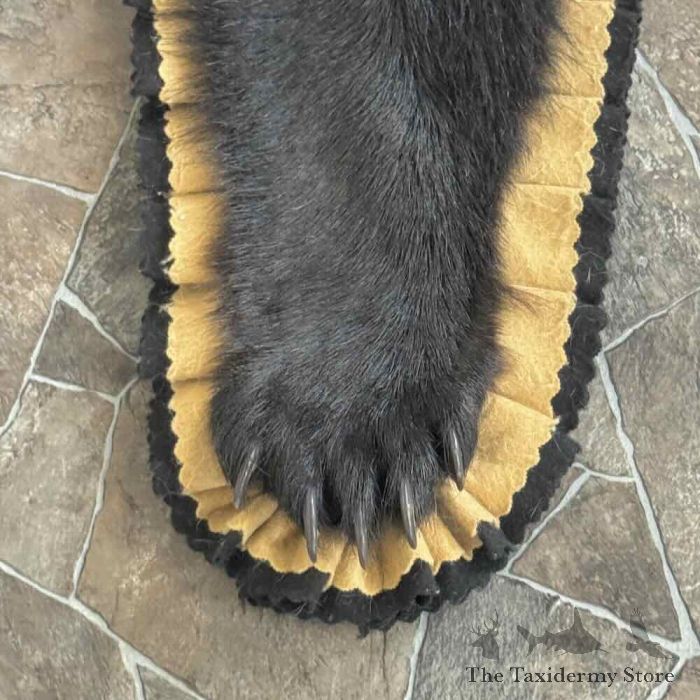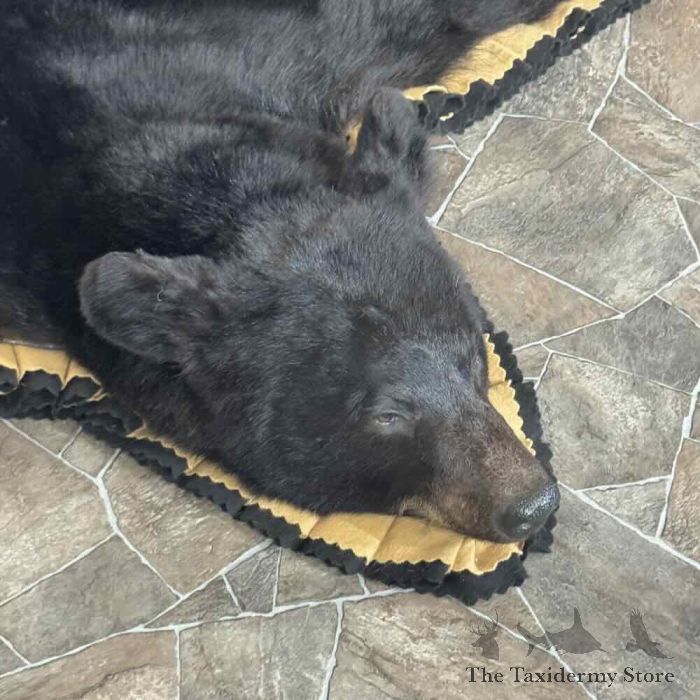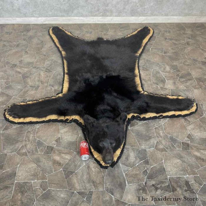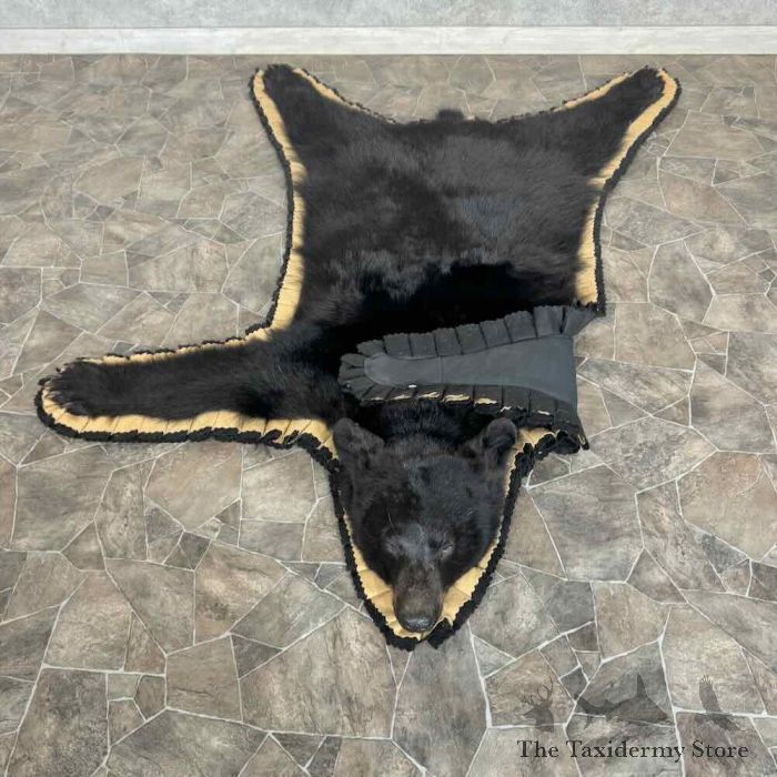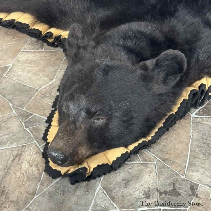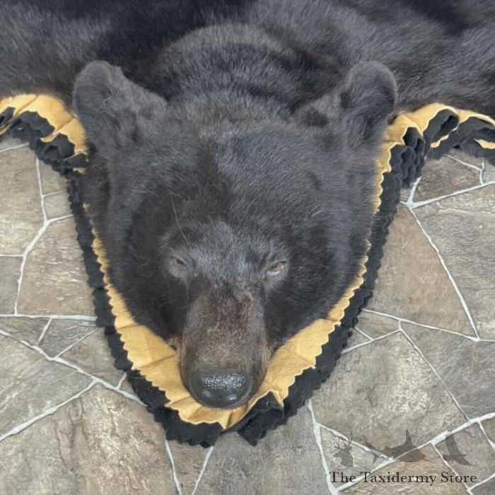 For Sale, we have a first-rate Black Bear full-size taxidermy rug, featuring a raised head and fabulous attention to detail. This rug also features phenomenal hide and hair, finished with a double furled tan and black felt accent border and a black backing, which provides durability and protection against wear. All these features combine to earn this item our Premierâ„¢ overall quality rating. All applicable measurements and dimensions are provided in the specifications section to help ensure this item will fit within your intended space, as well as meet expectations regarding the item’s featured attribute sizes, scores, etc.