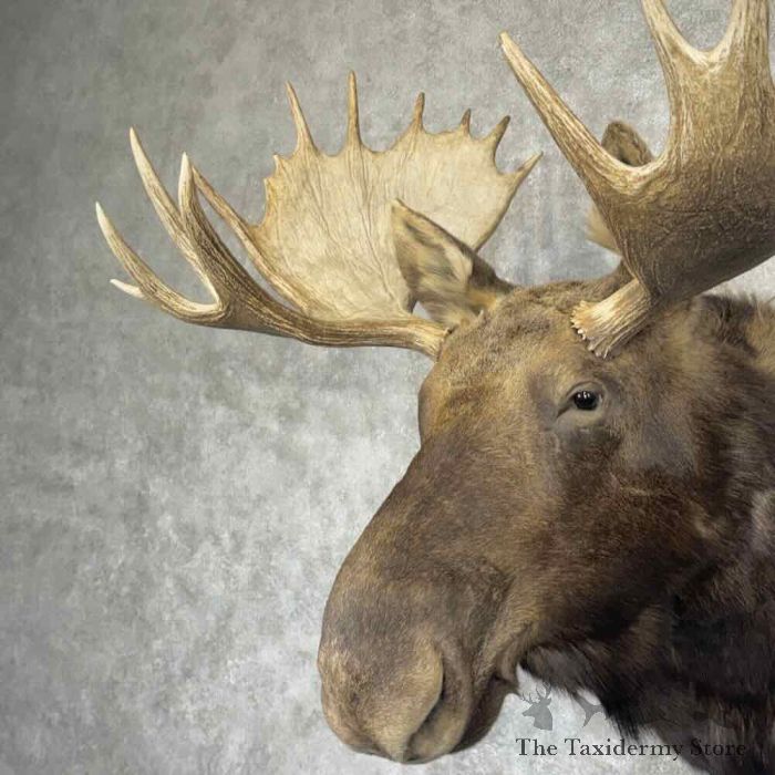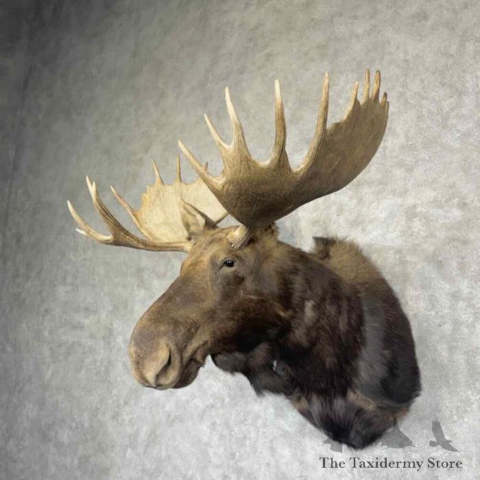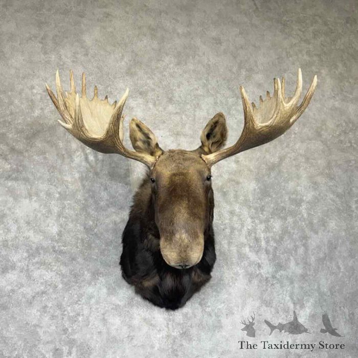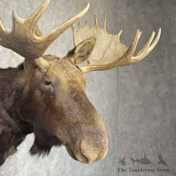 For sale, we have a sensational Canadian Moose taxidermy shoulder mount, posed with its head in a semi-upright position looking toward the viewer’s left side. This moose features a professionally tanned hide, a fabulous coat of hair, and a great set of detachable antlers that measures 46 5/8″ wide. All this combines with expert taxidermy craftsmanship to earn this mount our Premierâ„¢ overall quality rating. All applicable dimensions are included to help ensure this item will fit within your intended display space.
