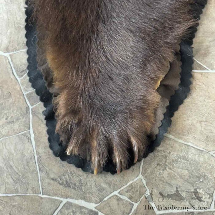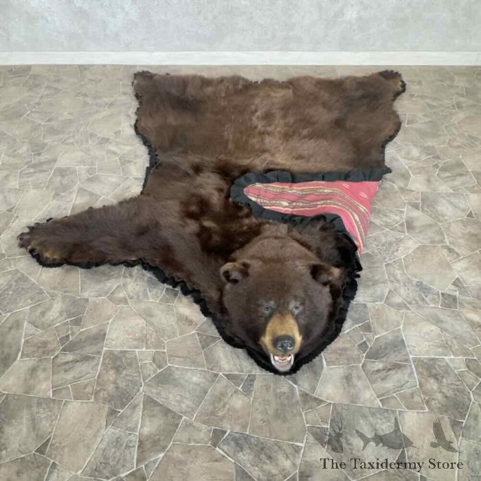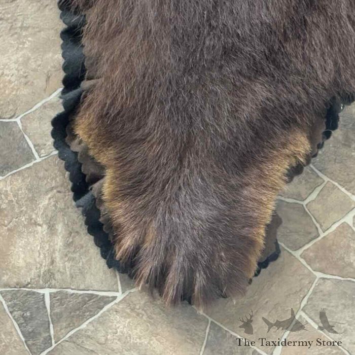 For Sale, we have a magnificent Chocolate Black Bear full-size taxidermy rug, featuring a raised head with an open mouth and fantastic attention to detail. The rug also features outstanding hide and hair, finished with a double furled brown and black felt accent trim and a southwestern print backing, which provides durability and protection against wear. All these features combine to earn this item our Premierâ„¢ overall quality rating. All applicable measurements and dimensions are provided in the specifications section to help ensure this item will fit within your intended space, as well as meet expectations regarding the item’s featured attribute sizes, scores, etc.