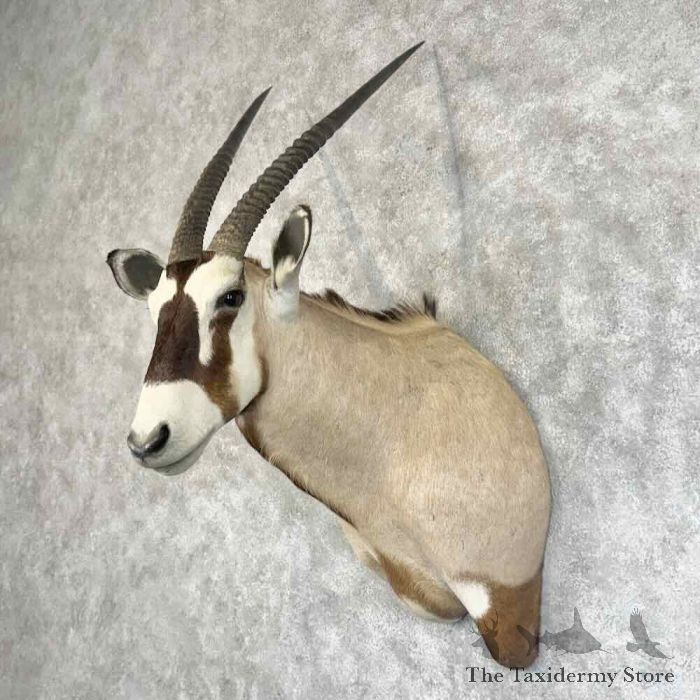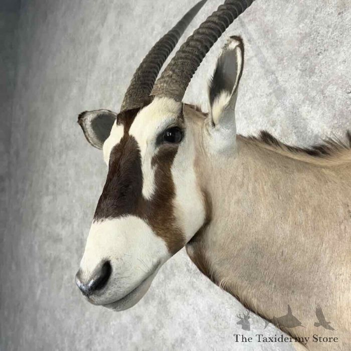 For sale, we have a first-rate Gemsbok Oryx taxidermy shoulder mount, posed in a semi-upright position looking slightly toward the viewer’s right side. This bull features stunning hair, an outstanding hide, and a great set of horns measure 31 3/8″” and 32 0/8″”. If you are looking to start a collection or simply add to it, then this is the piece for you! All applicable measurements and dimensions are provided to help ensure this item will fit within your intended space, as well as meet expectations regarding the item’s featured attribute sizes, scores, etc.