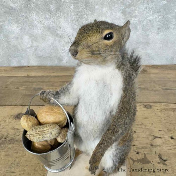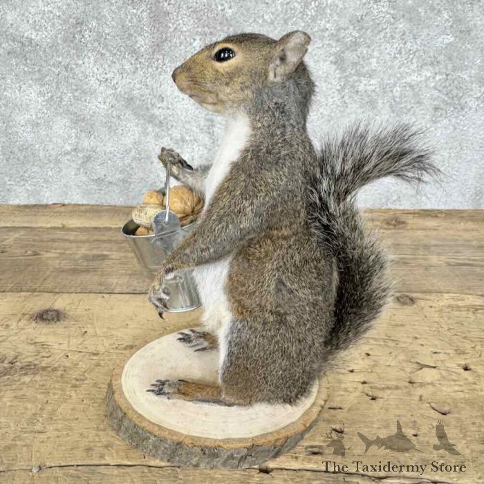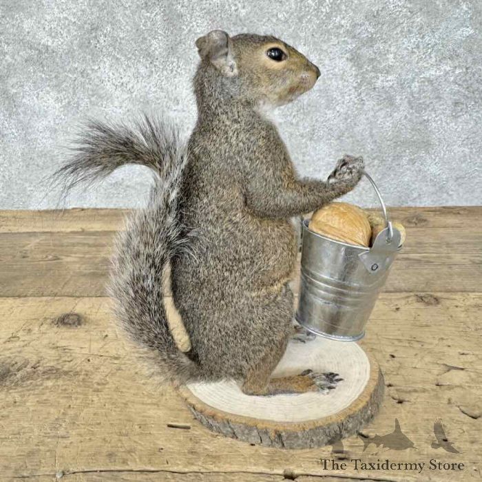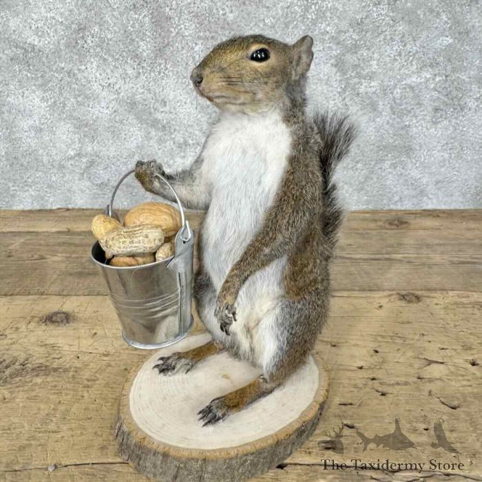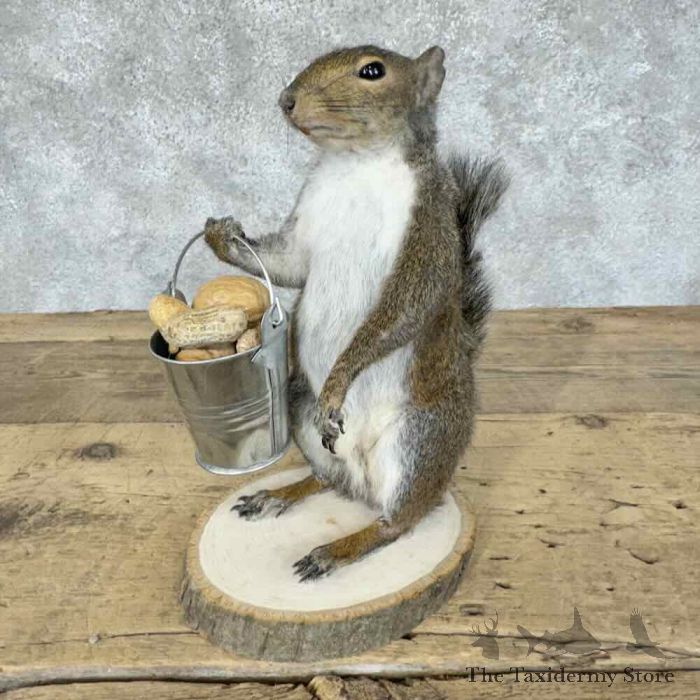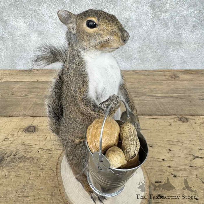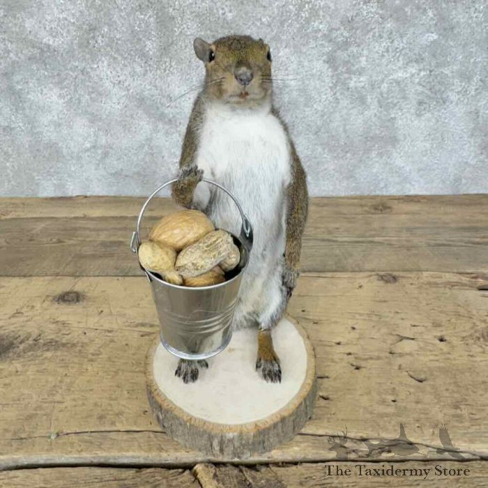 For sale, we have an outstanding Grey Squirrel novelty taxidermy mount, posed standing on a tree cookie base, holding a bucket full of nuts! The fantastic fur and skilled taxidermy craftsmanship combine to earn this item our Premierâ„¢ overall quality rating. All applicable dimensions are included to help ensure this item will fit within your intended display space.
