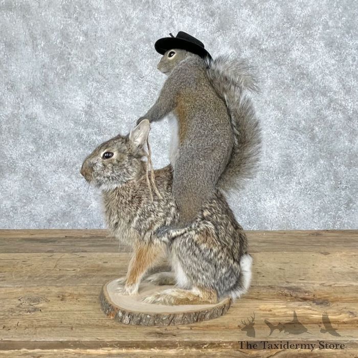 Novelty Grey Squirrel & Rabbit Mount for Sale is a striking, life-size creation designed to capture attention in any interior space. This expertly crafted piece features a grey squirrel playfully posed riding on the back of a rabbit, both preserved with thick, soft fur and exceptional attention to detail. The lifelike expressions and natural posture reflect premium craftsmanship, making it a standout option for collectors seeking taxidermy for sale that blends artistry with character.
