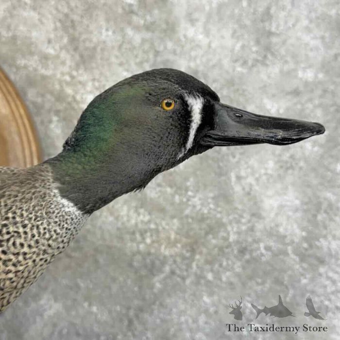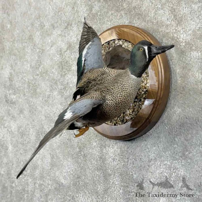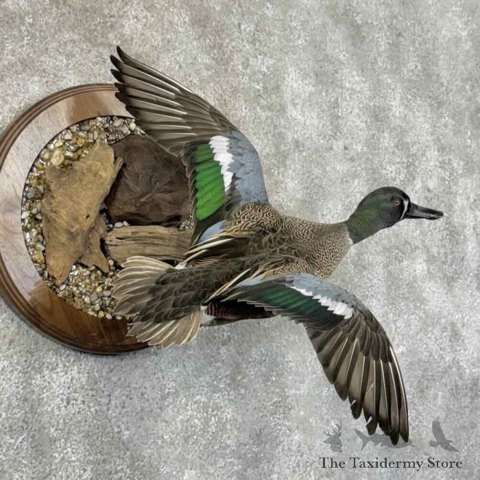 For sale, we have a marvelous Shoveler x Blue-Winged Teal cross duck taxidermy mount, posed soaring past a piece of driftwood, affixed to a custom dark walnut base with faux water and rock accents. This duck features amazing plumage, vibrant colors, and masterful taxidermy craftsmanship. This unique piece is perfect for an office or den. All applicable measurements and dimensions are provided in the specifications section to help ensure this item will fit within your intended space, as well as meet expectations regarding the item’s featured attribute sizes, scores, etc.