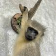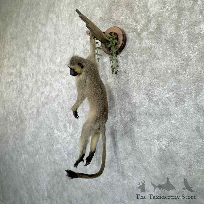 For sale, we have a phenomenal Vervet Monkey life-size taxidermy mount, posed hanging from a driftwood branch, affixed to a walnut plaque. This Vervet Monkey features wonderful hair and hide quality, along with outstanding attention to detail. This piece is best displayed when hung high, so that it looks down into the room. All applicable measurements and dimensions are provided in the specifications section to help ensure this item will fit within your intended space, as well as meet expectations regarding the item’s featured attribute sizes, scores, etc.