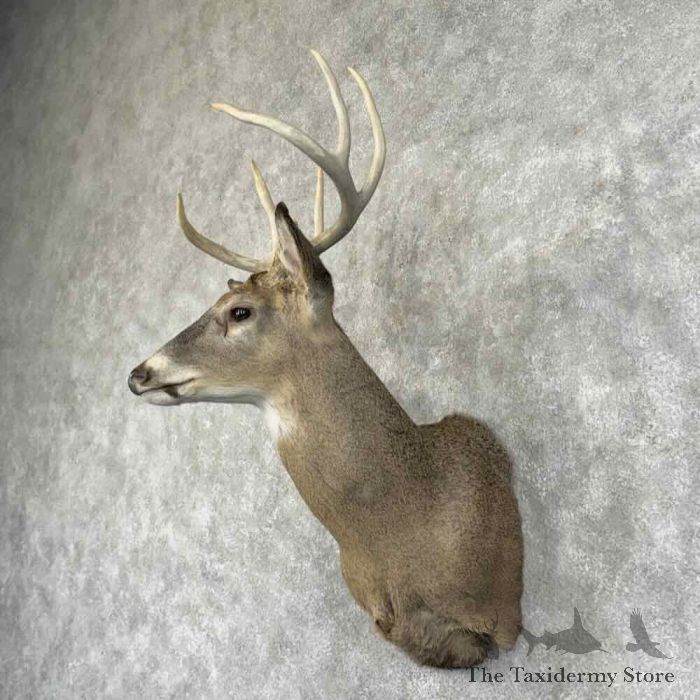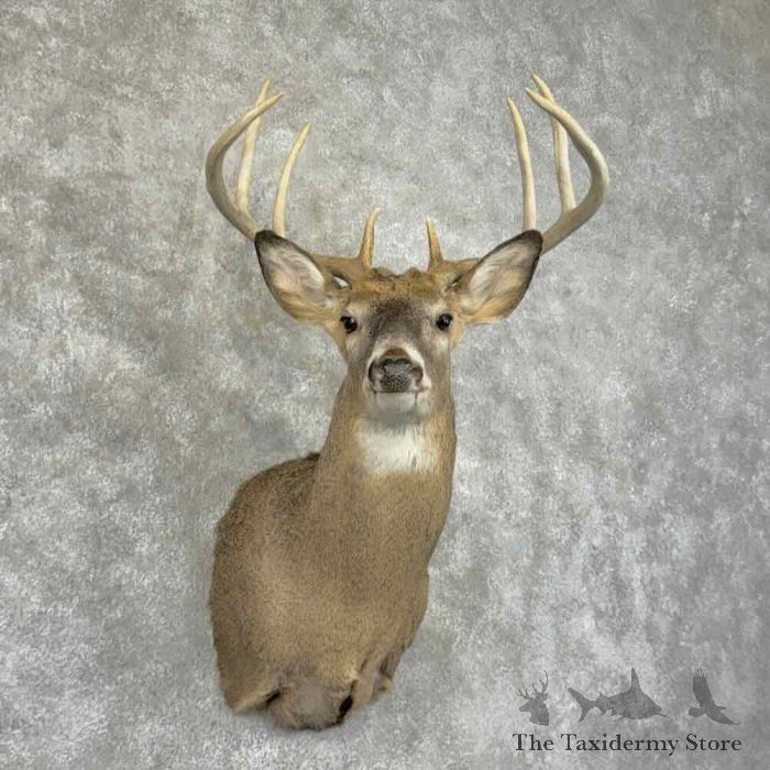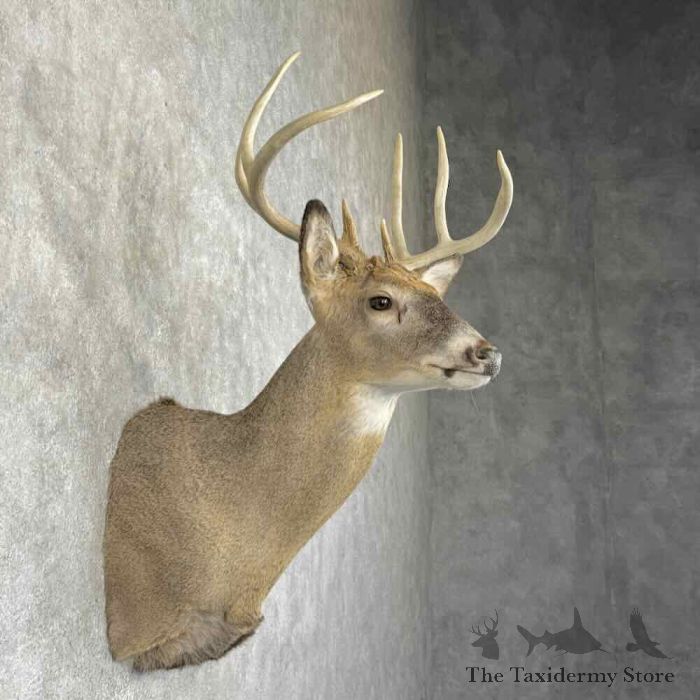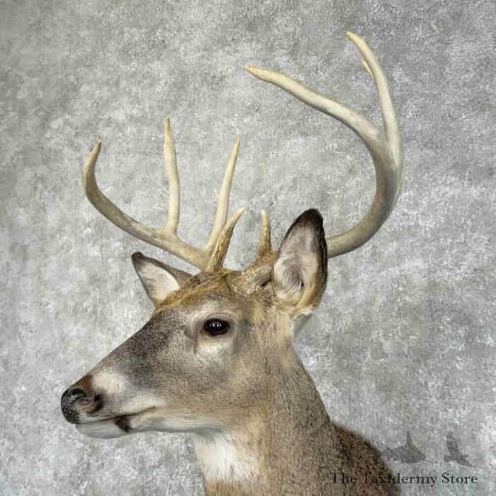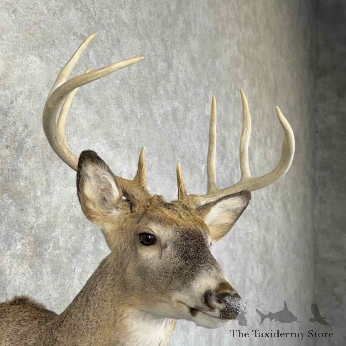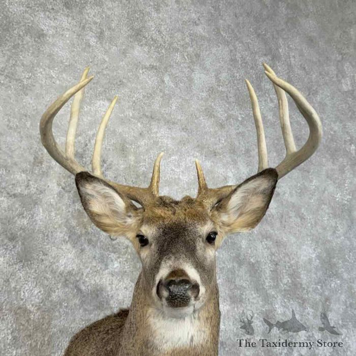 For sale, we have a first-rate Whitetail Deer taxidermy shoulder mount, posed in an upright position looking toward the viewer’s left side out into the room. This buck features a beautiful hide, stunning hair, expert taxidermy craftsmanship, and a gorgeous set of antlers that achieve a rough score of 120″. This piece is great for a cabin, office, restaurant, or home to get that ‘rustic’ feel. All applicable measurements and dimensions are provided in the specifications section to help ensure this item will fit within your intended space, as well as meet expectations regarding the item’s featured attribute sizes, scores, etc.
